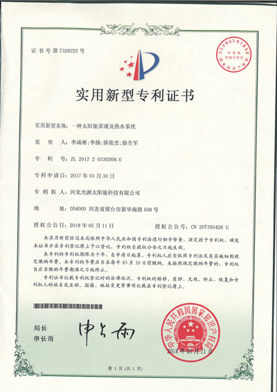 實(shí)用新型專(zhuān)利證書(shū)--一種太陽(yáng)能采暖及熱水系統(tǒng)(2)