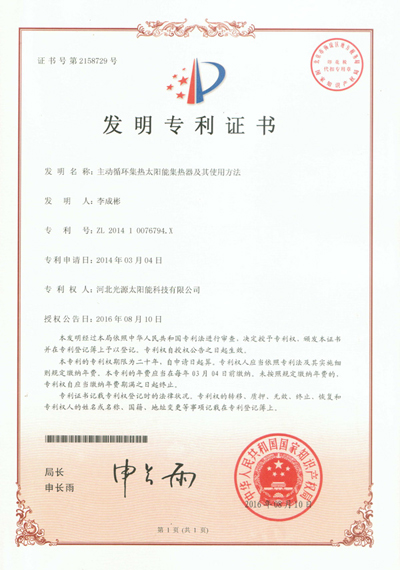 發(fā)明專(zhuān)利證書(shū)--主動(dòng)循環(huán)集熱太陽(yáng)能集熱器及其使用方法