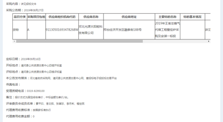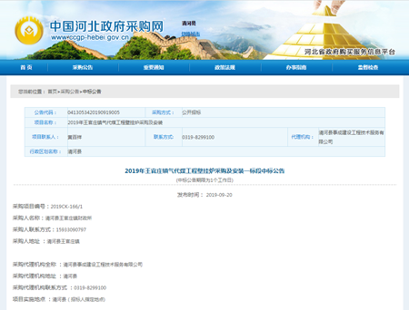 喜報頻傳,河北光源太陽能科技有限公司,在2019年09月16日,2019年王官莊鎮(zhèn)氣代煤工程壁掛爐采購及安裝項目的競標(biāo)中,憑借過硬的產(chǎn)品質(zhì)量,扎實(shí)高效的工作作風(fēng),卓越的運(yùn)作團(tuán)隊和良好的企業(yè)信譽(yù),以絕對的優(yōu)勢順利中標(biāo)。