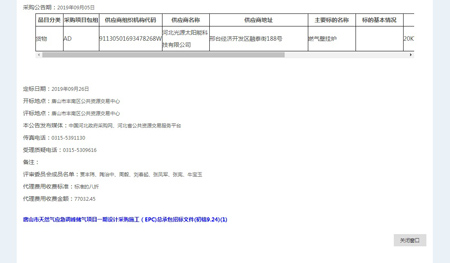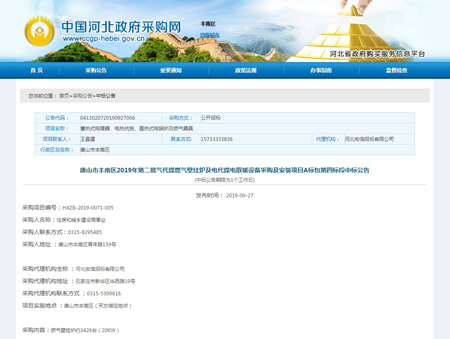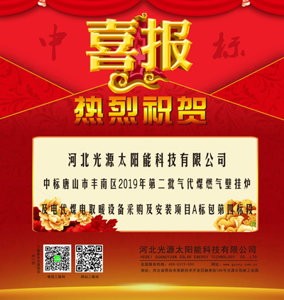 奮力拼搏創(chuàng)佳績,捷報(bào)頻傳奏凱歌。河北光源太陽能科技有限公司,在2019年09月27日,唐山市豐南區(qū)2019年第二批氣代煤燃?xì)獗趻鞝t及電代煤電取暖設(shè)備采購及安裝項(xiàng)目A標(biāo)包第四標(biāo)段中標(biāo),為我公司2019年度輝煌的經(jīng)營業(yè)績?cè)偬頋饽夭实囊还P。