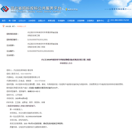 在抗疫的關(guān)鍵時(shí)期,復(fù)工復(fù)產(chǎn)正在如火如荼的進(jìn)行,沒(méi)有什么能比一份中標(biāo)通知書更能振奮人心了。在營(yíng)銷工作舉步艱難的特殊時(shí)期,河北光源太陽(yáng)能科技有限公司,中標(biāo)內(nèi)丘縣2020年度農(nóng)村冬季清潔取暖設(shè)備采購(gòu)及安裝工程,為我公司2020年度輝煌的經(jīng)營(yíng)業(yè)績(jī)?cè)偬頋饽夭实囊还P。