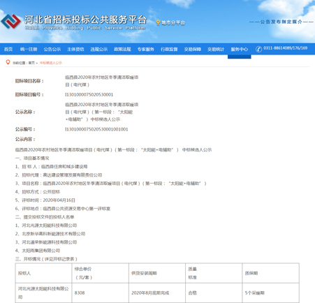 2020年,一場突如其來的疫情席卷全國,蔓延全球。隔離疫情不隔離服務(wù),在此特殊時期,光源公司積極踐行企業(yè)社會責(zé)任,保障復(fù)工復(fù)產(chǎn)的同時統(tǒng)籌疫情防控,嚴(yán)防死守全面做好疫情防控工作,科學(xué)有序復(fù)工復(fù)產(chǎn)。全體光源人振奮精神,團(tuán)結(jié)協(xié)作,高效率、高質(zhì)量投入復(fù)工后的公開投標(biāo)項(xiàng)目,憑借三十余年行業(yè)經(jīng)驗(yàn)和口口相傳的業(yè)界優(yōu)良口碑,以及雄厚的綜合實(shí)力,持續(xù)為客戶提供優(yōu)質(zhì)的產(chǎn)品和專業(yè)的售后服務(wù)。河北光源太陽能科技有限公司,中標(biāo)臨西縣2020年農(nóng)村地區(qū)冬季清潔取暖項(xiàng)目(電代煤)(第一標(biāo)段:“太陽能+電輔助”)。