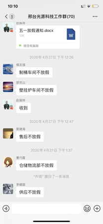 “五.一”前的4月27日,光源太陽能科技公司下發(fā)了“五.一”放假的通知。通知說:“經(jīng)公司領(lǐng)導(dǎo)研究決定,自2020年5月1日——2020年5月5日(“五.一”國(guó)際勞動(dòng)節(jié))放假五天?!?/span>