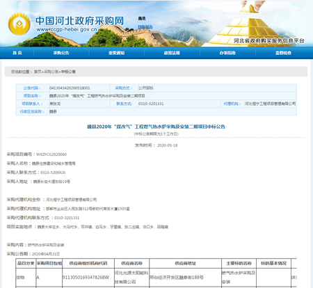 魏縣2020年“煤改氣”工程燃?xì)鉄崴疇t采購及安裝二期項(xiàng)目