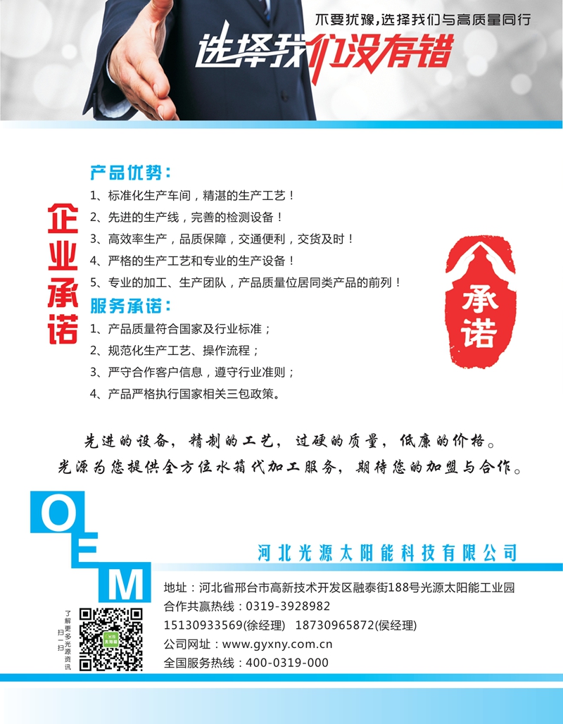 謙尊而光,酌水知源。前行中的光源太陽(yáng)能,感恩客戶(hù),固本創(chuàng)新,以振興民族太陽(yáng)能光熱產(chǎn)業(yè)為己任,將“打造太陽(yáng)能世界品牌”作為企業(yè)發(fā)展目標(biāo),高歌奮進(jìn),光耀東方!
